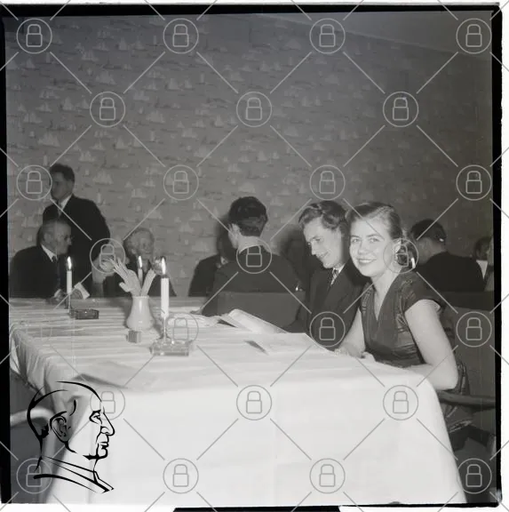 middag, fest, bord, ljus, duk, klänning, leende, gäster, 1940-tal, svartvitt, socialt, samling, restaurang, dekoration, samtal, elegans, stil, kvinnor, män, tradition, festligheter, atmosfär, interiör, nöje, gemenskap, evenemang, bakgrund, sittande, belysning, servetter
