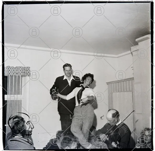 dans, musik, fiol, fest, glädje, par, inomhus, skratt, svartvitt, 1950-tal, fönster, gardiner, man, kvinna, musiker, stående, kläder, skjorta, byxor, hatt, samling, socialt, tradition, kultur, retro, historisk, rum, interiör, människor, gemenskap