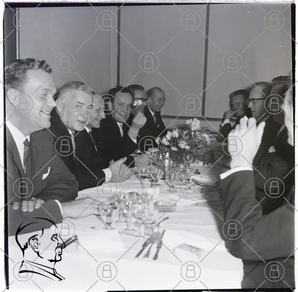 middag, män, bord, samtal, fest, glas, blommor, servetter, kostymer, leenden, svartvitt, affärsmöte, samling, mat, dryck, vänskap, diskussion, formell, evenemang, tradition, 1900-tal, socialt, nätverkande, professionellt, gemenskap, stil, elegans, atmosfär, interaktion, nöje