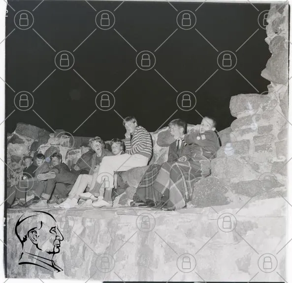 natt, ungdomar, samling, ruiner, sten, kläder, skratt, gemenskap, mörker, fotografering, tradition, historia, avkoppling, utomhus, vänskap, minnen, 1960-tal, socialt, kultur, fritid, aktivitet