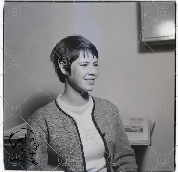 porträtt, kvinna, leende, svartvitt, 1960-tal, kläder, inomhus, sittande, frisyr, naturligt ljus, bakgrund, bord, dokument, fotografi, ungdom, ansiktsuttryck, stil, mode, vintage, nostalgi