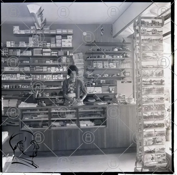 butik, kvinna, disk, kort, tidningar, hyllor, varor, postkort, kontor, papper, försäljning, retro, svartvitt, inredning, kund, kassaskåp, produkter, affär, service, detaljhandel, 1960-tal, lokal, traditionell, reklam, varumärken, souvenirer, presentartiklar, kiosk, småföretag, samhälle
