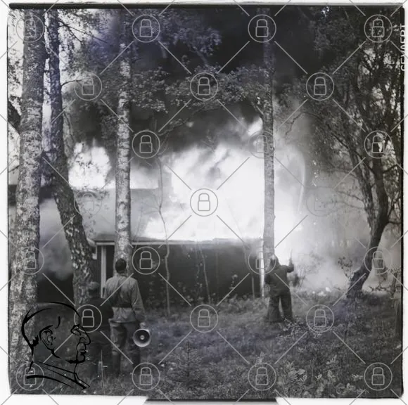 brand, skog, träd, rök, eldar, män, byggnad, 1940-tal, svartvit, natur, brandmän, megafon, utomhus, katastrof, historia, fotografering, ljus, skogsområde, räddning, brandbekämpning, åtgärder, samhälle, miljö, säkerhet, övervakning, skogsbrand, ångande, förstörelse, dramatik