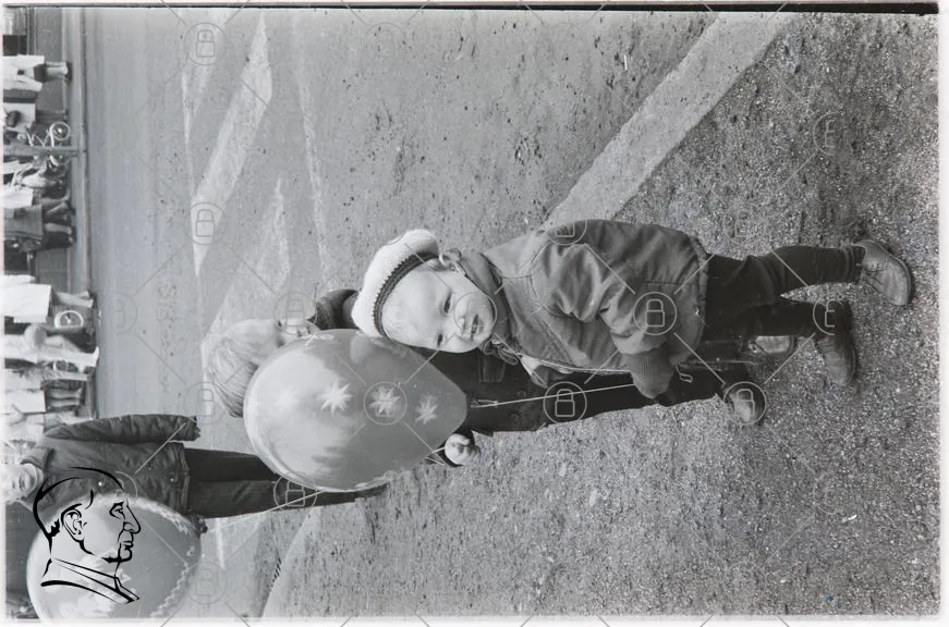 barn, ballong, svartvit, leende, hatt, ytterkläder, gatan, lek, barndom, glädje, fotografi, retro, 1960-tal, utomhus, fest, nöje, syskon, familj, minnen, nostalgi