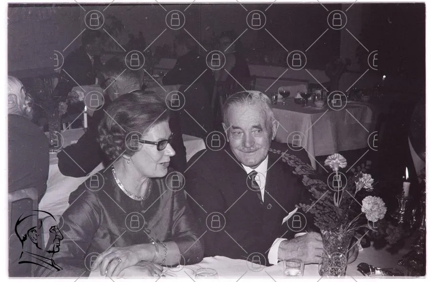 middag, par, äldre, fest, bordsdukning, blommor, glas, servetter, leende, svartvitt, kläder, smycken, restaurang, socialt, samvaro, 1960-tal, bord, stolar, ljus, mat, dryck, samtal, minnen, tradition, familj, vänskap