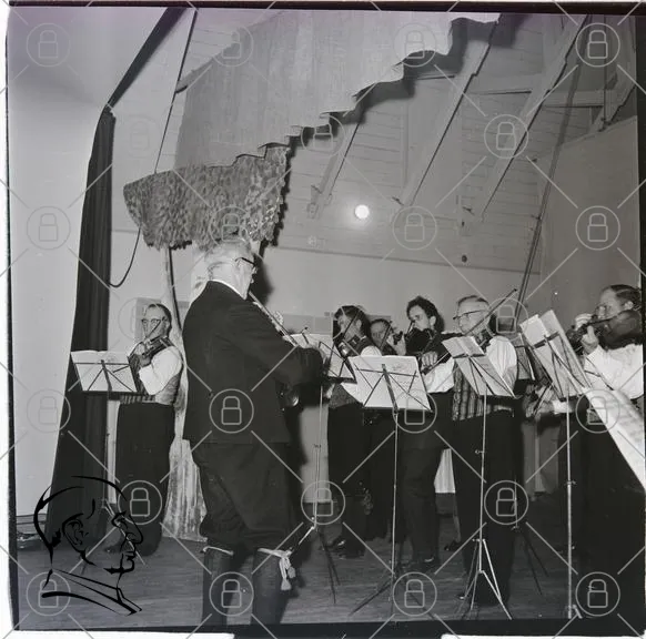 musiker, orkester, fiol, konsert, svartvitt, scen, uppträdande, kläder, noter, instrument, traditionell, kultur, föreställning, publik, musik, 1950-tal, samspel, artister, förening, evenemang, lokal, ljus, bakgrund, grupp, män, kvinnor, stående, samling, musikaliskt, underhållning, klassisk
