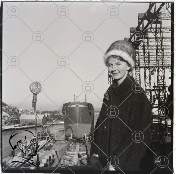 kvinna, hatt, skepp, hamn, byggarbetsplats, svartvitt, vinter, kläder, konstruktion, mikrofon, bakgrund, industri, 1900-tal, fotografi, porträtt, sjöfart, båt, landskap, trä, metall, stil, mode, historisk, kvinna i fokus, sjö, arbete, teknik, tradition, kultur, miljö