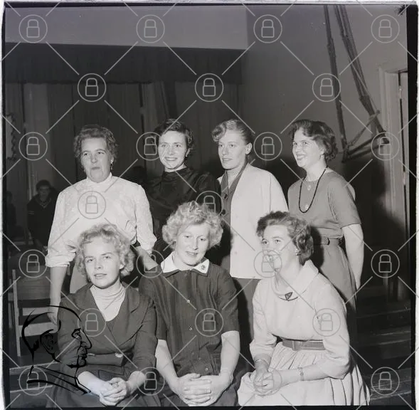 gruppfoto, kvinnor, svartvitt, klänningar, frisyrer, 1950-tal, inomhus, leenden, sittande, stående, scen, gardiner, vintage, retro, mode, samling, porträtt, historisk, socialt, samvaro, kläder