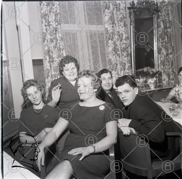 grupp, människor, fest, 1950-tal, kläder, leenden, bord, inomhus, svartvitt, socialt, samvaro, kvinnor, män, fotografi, retro, stil, eleganta, interiör, glas, skratt, vänskap, minnen, tradition, familj, nöje, samling, uttryck, glädje, tidsepok