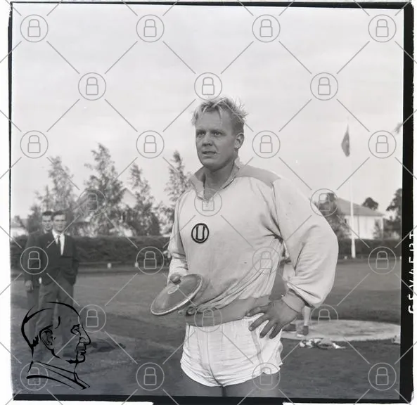 diskus, idrott, man, sport, tävling, träning, 1950-tal, utomhus, kläder, atlet, kast, gym, flagga, gräs, prestation, fokus, styrka, motion, historisk, svartvit, fotografi, sportutrustning, idrottsman, teknik, koncentration, tradition, idrottsevenemang, kroppsspråk, prestation, energi