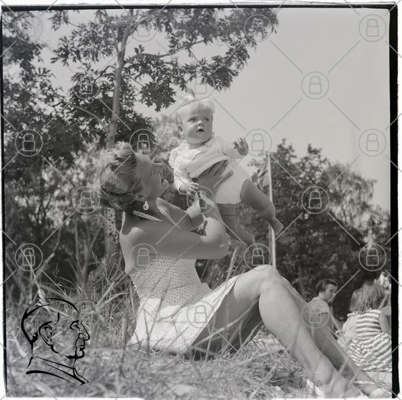 kvinna, barn, sommar, park, gräs, leende, familj, svartvitt, klänning, natur, trä, lek, minnen, 1950-tal, utomhus, glädje, samvaro, barnvagn, fotografi, nostalgi, vänskap