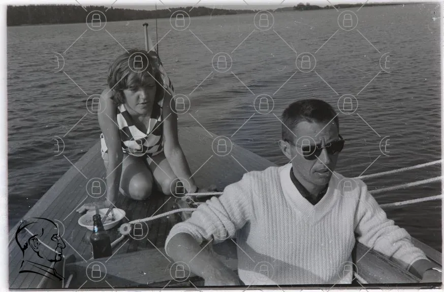 båt, sjö, sommar, människor, kvinna, man, solglasögon, rutigt, kläder, fiske, avkoppling, vatten, natur, aktivitet, fritid, öl, mat, roddbåt, landskap, svartvitt, retro, 1970-tal, vänskap, familj, semester, nöje, utomhus, sport, tradition
