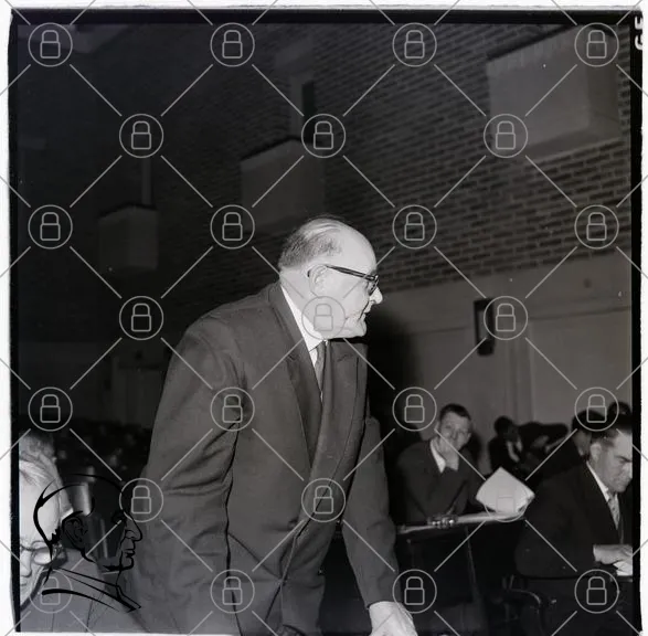 man, kostym, glasögon, talare, möte, publik, svartvitt, inomhus, konferens, 1900-tal, diskussion, föreläsning, akademisk, allvarlig, presentation, sittande, åhörare, rum, belysning, väggar, brickor, stolar, kläder, uttryck, fokus, interaktion, professionell, miljö, historisk, dokumentär