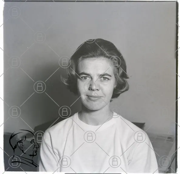 kvinna, porträtt, svartvitt, leende, hår, tröja, inomhus, fotografi, 1960-tal, ansikte, naturligt, enkel, bakgrund, uttryck, klassisk, stil, ungdomlig, ögon, person, vintage, stilla, personlig, identitet, känsla, lugn, skönhet, nostalgi, mode, kultur