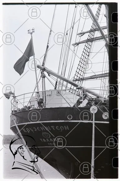 fartyg, segelbåt, flagga, Tallinn, Kryženštern, hamn, mast, rigg, svartvitt, sjöfart, träbåt, segel, marin, historia, resor, äventyr, hav, kust, båtliv, tradition, kultur, Estland, skepp, sjö, transport, navigering, ankar, sjöman, båtar