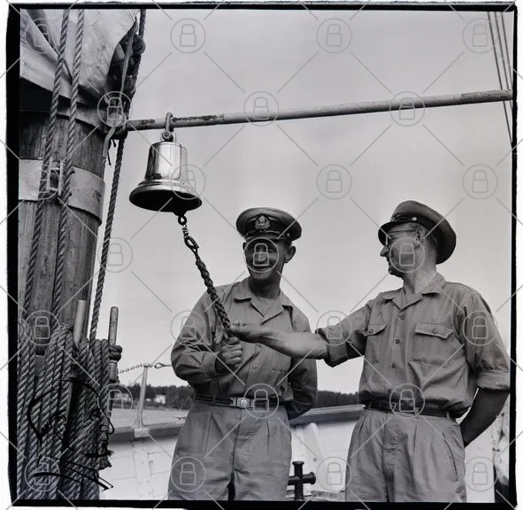 sjömän, skeppsklocka, uniform, militär, sjöofficerare, rep, fartyg, leende, utomhus, svartvitt foto, historisk, maritim, klockringning, hattar, sjöfart, teamwork, samarbete, glädje, tradition, hav, skeppsdäck, kommunikation, signalering, sjötransport, navigering, sjöman, marinen, sjöväg, sjöresa, sjömiljö