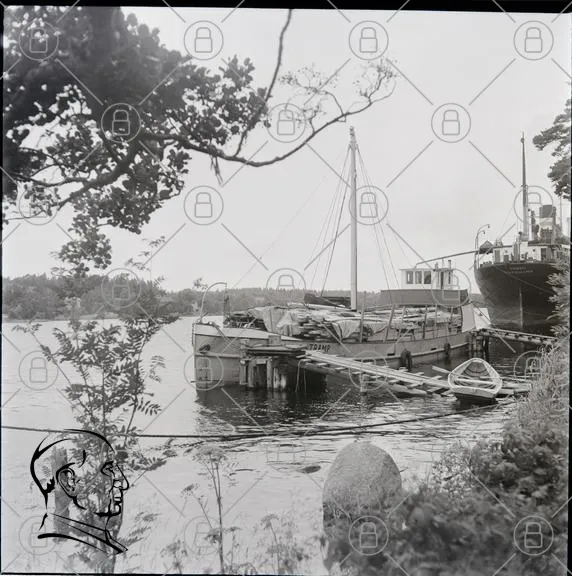 båt, hamn, vatten, träbrygga, skog, träd, segelbåt, lastfartyg, landskap, svartvit, båtar, sjö, natur, transport, kaj, båtplats, stillhet, reflektion, moln, sommar, båtliv, fiske, tradition, industri, miljö, lugn, svensk, kust, historia, kultur