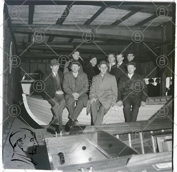 båt, män, verkstad, trä, grupp, hattar, sittande, stående, gammal, svartvitt, byggnad, marina, hantverk, fiske, tradition, historia, båtbyggeri, inomhus, samarbete, gemenskap, arbetsmiljö, 1900-tal, handarbete, båtmodell, träarbete, fotografering, nostalgi, yrkesliv, båtindustri