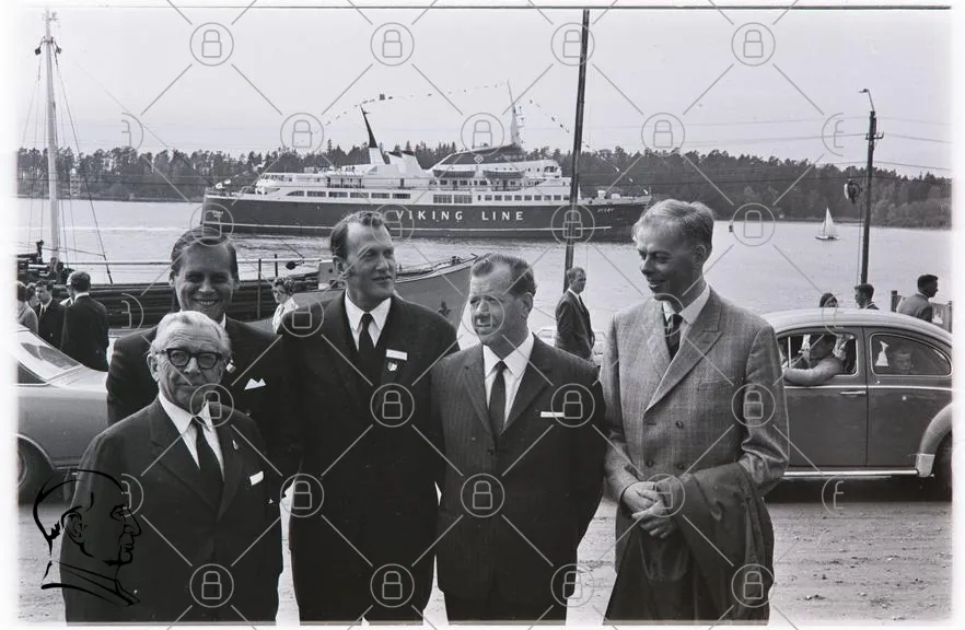 Viking Line, båt, hamn, män, kostymer, svartvitt, 1960-tal, sjöfart, gruppfoto, träbåt, landskap, vatten, träd, kläder, affärsmän, historisk, resor, passagerarfartyg, marin, företag, tradition, skärgård, Sverige, Finland, möte, logotyp, fotografering, stil, nostalgi, transport