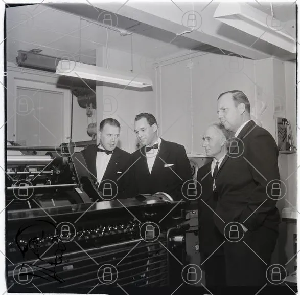 tryckeri, män, kostymer, svartvitt, maskin, teknik, 1960-tal, affärsmän, tryckpress, kontor, samarbete, professionellt, industri, möte, diskussion, kreativitet, tradition, hantverk, design, produktion, företag, historia, arbetsmiljö, innovation, kvalitet, detaljer, stil, kläder, affärsverksamhet, team