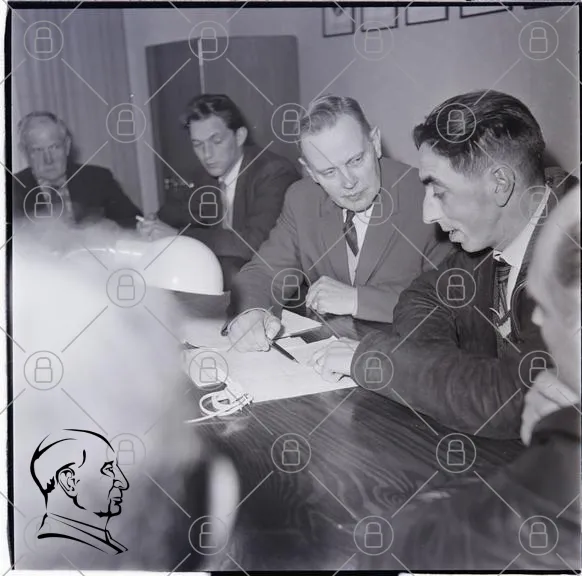möte, män, skrivbord, dokument, diskussion, 1900-tal, svartvitt, affärsmän, kontor, hår, kostymer, glasögon, anteckningar, telefon, hjälm, professionellt, samarbete, ledarskap, ansiktsuttryck, fokus, interaktion, grupp, inomhus, formell, presentation, planering, strategi, beslut, kommunikation, historia