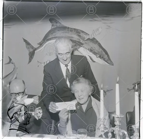 haj, fest, middag, äldre, man, kvinna, blommor, ljus, väggmålning, sällskap, kort, leende, 1960-tal, svartvitt, dekoration, bord, glas, kläder, samtal, glädje