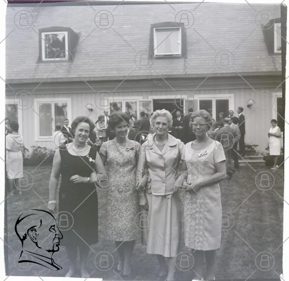 kvinnor, fest, trädgård, hus, 1960-tal, klänningar, sällskap, leende, vintage, svartvitt, socialt, samling, blommor, accessoarer, fotografering, bakgrund, människor, stil, elegans, gemenskap, minnen