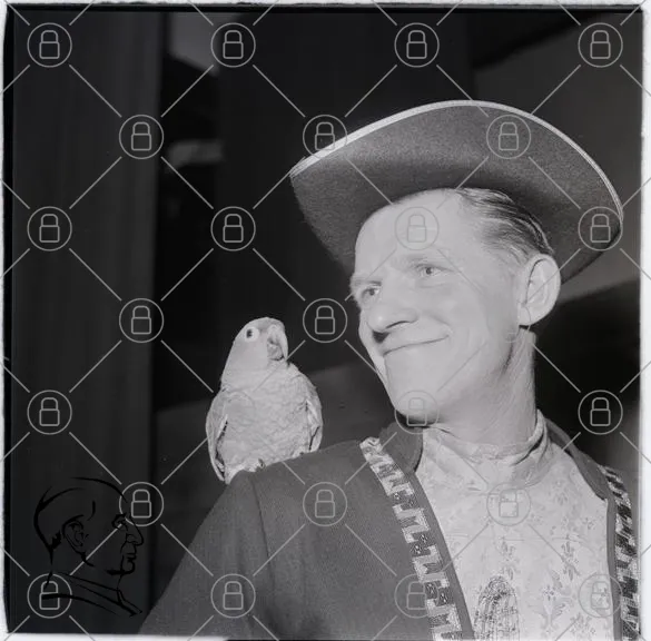 man, fågel, hatt, leende, svartvitt, kostym, porträtt, djur, underhållning, cirkus, vänskap, kläder, traditionell, artist, scen, 1950-tal, fotografi, uttryck, karaktär, natur, fågelvän, humor, stil, kultur, vintage, personlig, ansikte, detalj, bakgrund, miljö