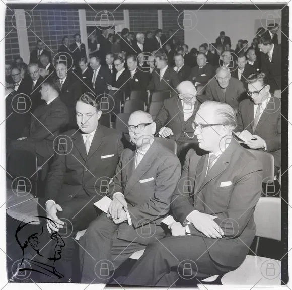 möte, män, kostymer, publik, sittande, konferens, 1960-tal, svartvitt, inomhus, affärsmän, diskussion, formell, samling, åhörare, stolar, kläder, glasögon, ansiktsuttryck, professionell, evenemang, grupp, samarbete, presentation, fokus, allvarlig, interaktion, social, traditionell, stil, organisation