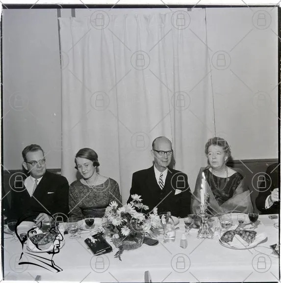 middag, fest, bord, gäster, klänning, kostym, vin, blommor, dukat, 1950-tal, svartvitt, sällskap, leenden, servetter, mat, elegans, samtal, tradition, högtid, samvaro, fotografering, bakgrund, dukning, stil, artighet, socialt, evenemang, familj, gemenskap, minnen