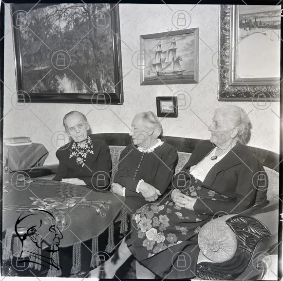 äldre kvinnor, sittande, inomhus, svartvitt, möbler, väggkonst, bord, dukar, kläder, ansiktsuttryck, samtal, hem, traditionell, interiör, fotografi, nostalgi, generationer, vänskap, sällskap, kultur, historia, familj, livserfarenhet, hemtrevligt, samling, minnen, tidlös, porträtt, socialt, gemenskap