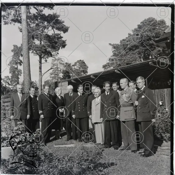 gruppfoto, män, uniformer, trädgård, träd, staket, skjul, kostymer, formella kläder, utomhus, svartvitt, historisk, samling, möte, sommar, gräs, buskar, blommor, soligt, skugga