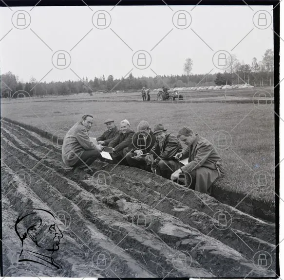 jordbruk, åker, plöjning, män, grönska, traktorer, fält, forskning, 1950-tal, landskap, samarbete, jord, skörd, tradition, teknik, analys, mark, växtlighet, inspektion, plöjningslinjer, historia, landsbygden, grupp, arbete, natur, miljö, odling, skogslandskap, studier, jordbruksteknik, plöjningsmetoder