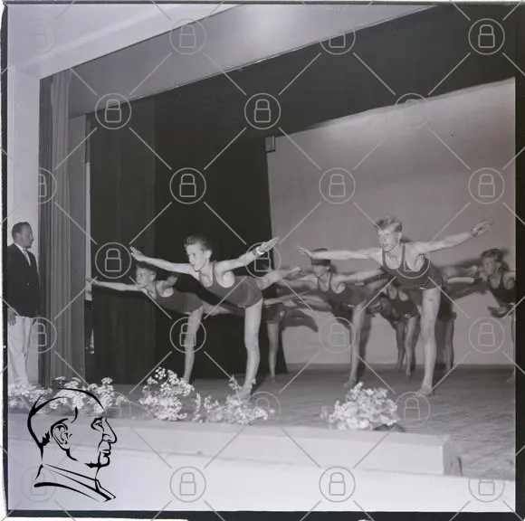 dans, uppträdande, scen, gymnastik, pojkar, kostymer, svartvitt, publik, blommor, rörelse, koreografi, träning, sport, ungdomar, prestation, stil, balans, konsert, föreställning, 1950-tal, klassisk, samarbete, uttryck, kroppsspråk, tradition, evenemang, artister, dansare, show