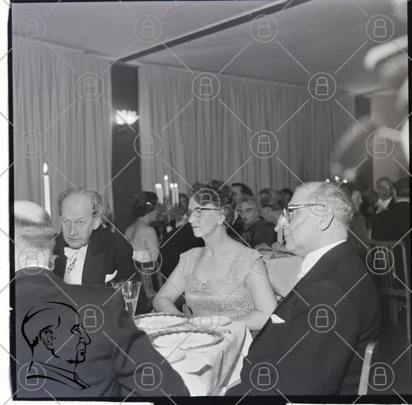 middag, fest, 1960-tal, klädd, eleganta kläder, bord, ljus, gäster, mat, glas, sällskap, kvinnor, män, socialt, samtal, inomhus, restaurang, stil, vintage, svartvitt, dekoration, servett, tallrik, stämning, högtid, samling, tradition, kultur, evenemang