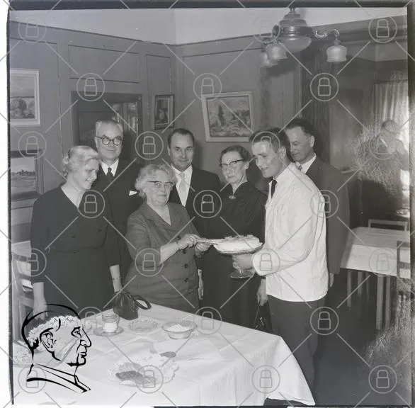 kalas, tårta, fest, familj, 1950-tal, kläder, leenden, bord, inredning, svartvitt, servitör, kvinnor, män, tradition, samvaro, bakverk, dukning, glädje, minnen, sällskap, festligheter, kaffe, te, servett, fotografi, socialt, gemenskap, hembakat, firande, artighet