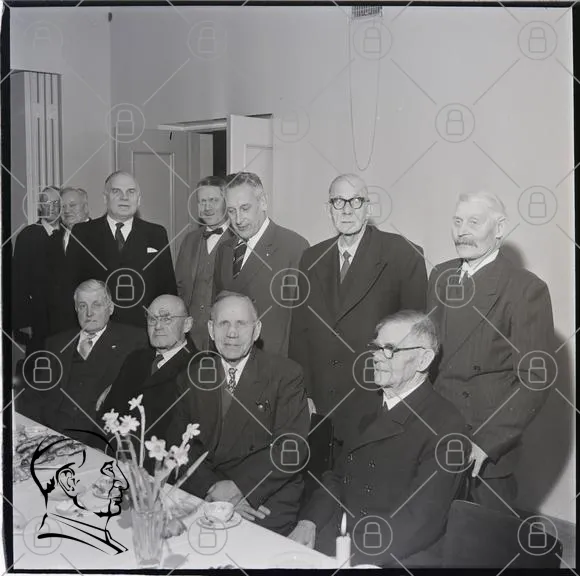 män, äldre, grupp, möte, kostymer, inomhus, bord, blommor, kaffekoppar, fotografi, svartvitt, 1900-tal, ansikten, traditionell, samling, stil, interiör, diskussion, sällskap, vänskap