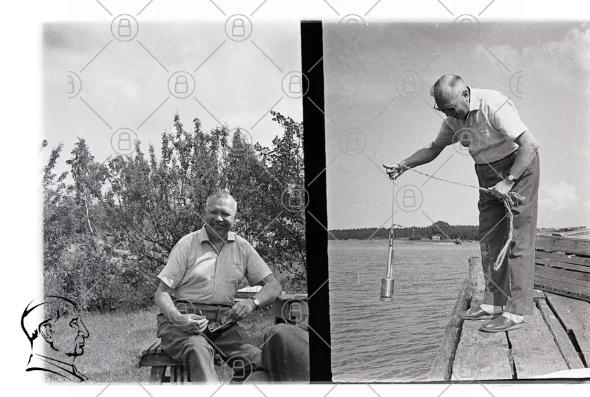 fiskare, sjö, sommar, natur, vänner, skratt, fiskeutrustning, träbänk, grönska, himmel, vatten, avslappning, fritid, gammal bild, svartvit, tradition, hobby, utomhus, nöje, landskap