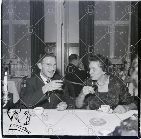 middag, fest, par, samtal, kläder, 1950-tal, bord, glas, ljus, leende, kaffe, te, dukat, inredning, eleganta, socialt, sällskap, kvinnor, män, traditionell, svartvitt, fotografi, nostalgi, interiör, stil, gemenskap, festligheter, kultur, historia, tidsepok
