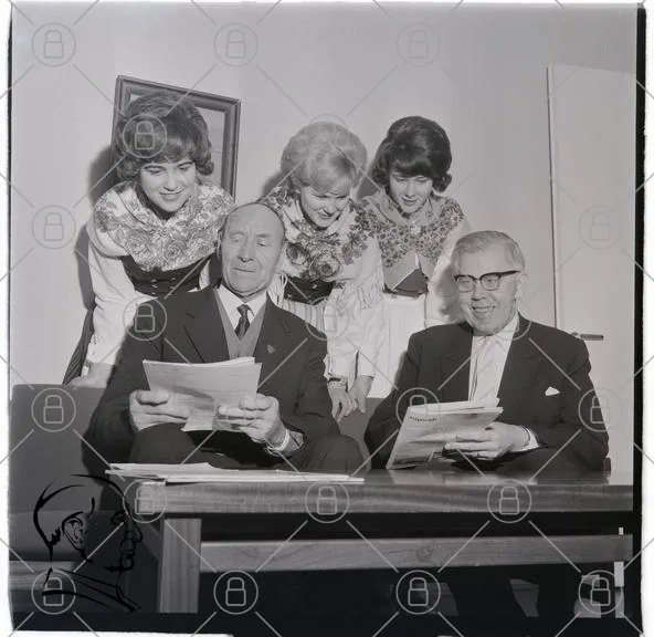 svartvit, foto, män, kvinnor, traditionella kläder, dokument, bord, leende, 1960-tal, samarbete, kultur, grupp, interaktion, festkläder, retro, stil, ansikten, kläder, möte, glädje, presentation, information, tidning, papper, bakgrund, inomhus, sittande, stående, porträtt