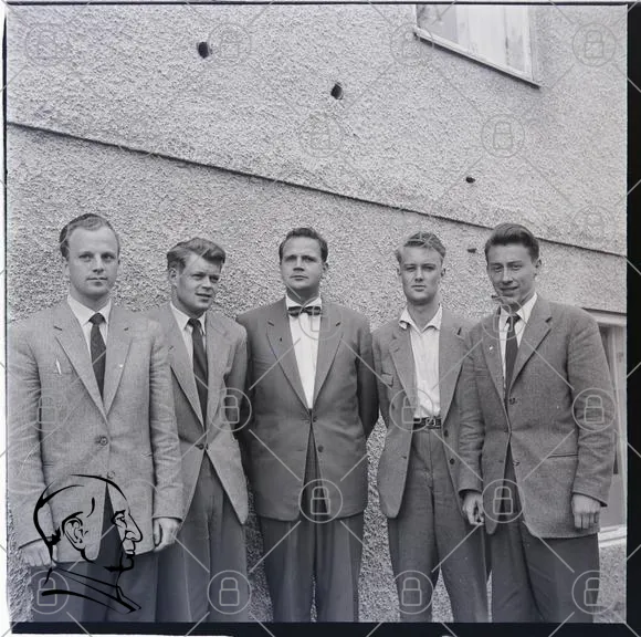 fem män, kostymer, svartvitt, 1950-tal, bowtie, kläder, gruppfoto, leende, byggnad, vägg, stil, mode, porträtt, ungdomar, retro, traditionell, socialt, samling, män, fotografi