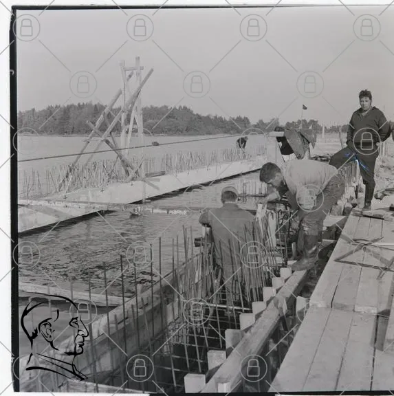 byggarbetsplats, konstruktion, arbete, män, betong, stål, flod, bro, byggmaterial, hantverkare, verktyg, arbetskläder, vatten, landskap, industri, 1900-tal, historisk, teamwork, byggnadsarbete, byggnadsställning