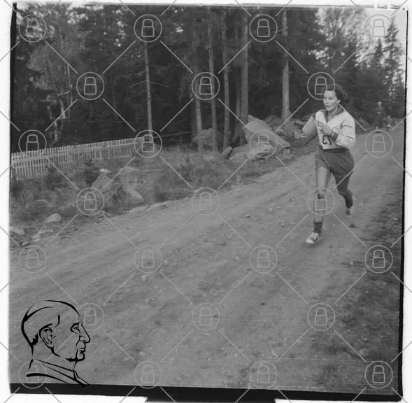 löpare, skog, väg, grus, motion, sport, kvinna, träning, natur, hastighet, tävling, friluftsliv, 1960-tal, ungdom, aktiv, landskap, jogging, kläder, sneakers, träden, stenar, bakgrund, fotografering, svartvit, rörelse, energi, uthållighet, friidrott, lopp, utomhus