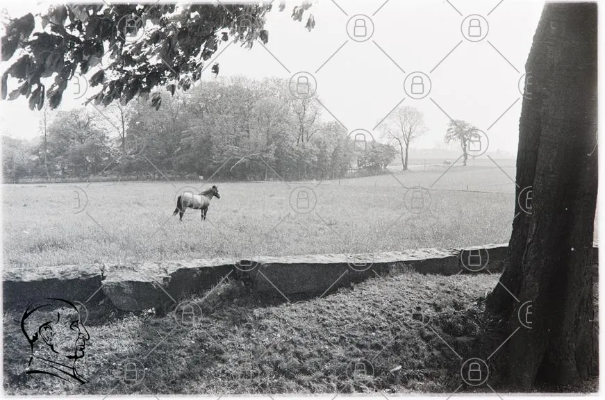 häst, äng, träd, landskap, svartvitt, natur, gräs, fält, staket, horisont, djur, utomhus, sommar, lugn, stillhet, fotografering, landskapsbild, rural, vacker, frihet