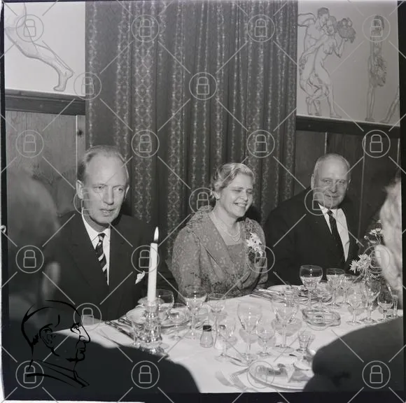 middag, fest, bord, gäster, klänning, kostym, ljus, glas, dukning, leende, 1900-tal, svartvitt, dekoration, konst, väggmålning, elegans, socialt, samvaro, tradition, måltid, mat, servett, blomma, sällskap, högtid, stil, kultur, historia, gemenskap