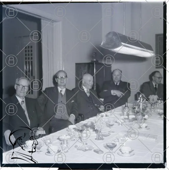 middag, män, bord, glas, kaffe, dessert, blommor, fest, kläder, sällskap, lampor, inomhus, möte, äldre, stolar, dukat, samtal, tradition, samvaro, stil, elegans, tidsepok, fotografi, svartvit, socialt, festligheter, gemenskap, kultur, historia