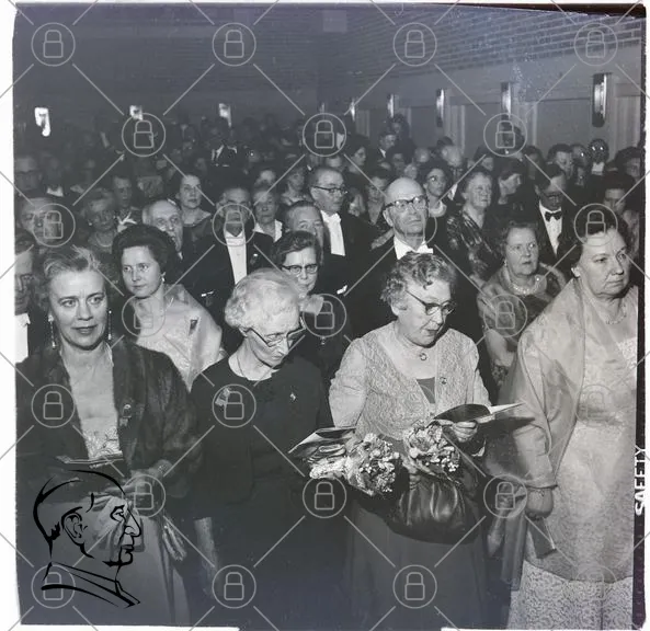 publik, evenemang, kläder, kvinnor, män, samling, fest, 1900-tal, svartvitt, blommor, program, gala, tradition, högtid, ansiktsuttryck, klänningar, kostymer, sällskap, minnen, kultur, historia, festligheter, gemenskap, stämning, artister, applåder, ceremonier, samhörighet, festlig