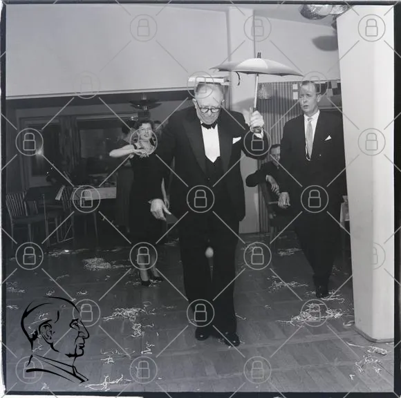 fest, dans, paraply, kostym, svartvitt, 1950-tal, glädje, skratt, festligheter, dekorationer, konfetti, par, män, kvinnor, socialt, underhållning, tradition, festkläder, dansgolv, feststämning
