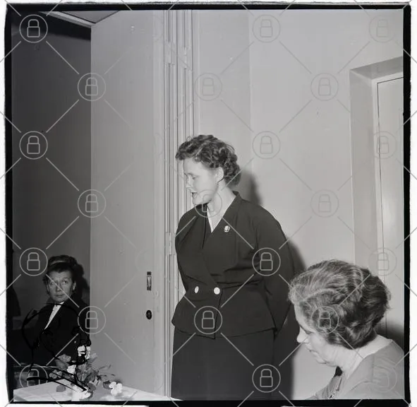 kvinna, tal, möte, blommor, bord, kostym, interiör, åhörare, svartvit, 1950-tal, formellt, stående, sittande, vägg, dörr, grupp, diskussion, presentation, äldre, frisyr