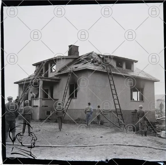 hus, byggarbetsplats, stegar, arbetare, renovering, tak, byggmaterial, gråskala, 1900-tal, byggnadsarbete, brand, skador, militär, män, arbete, byggnadsställning, fönster, väggar, takläggning, utomhus, landskap, historia, gammal, struktur, byggnad, hantverkare, säkerhet, verktyg, inspektion, arbete